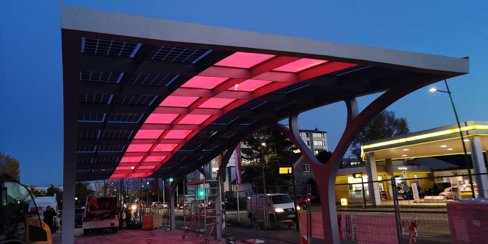 En complément de ces attentes, le parvis est désormais complet grâce à la « vague d’énergie », qui s’illumine de différentes couleurs grâce à des LED intégrées. Le nom vient de la forme de l’installation photovoltaïque qui recouvre une structure en acier et qui est constituée de 42 modules photovoltaïques en verre feuilleté de sécurité incurvés.