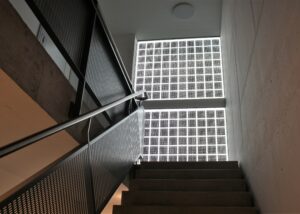 Façade isolante cage d'escalier EHL Partenaire : BE Netz AG Modules : VSG ESG 5/5 | différentes tailles | cellules perforées Transparence : ~ 31 % [...]